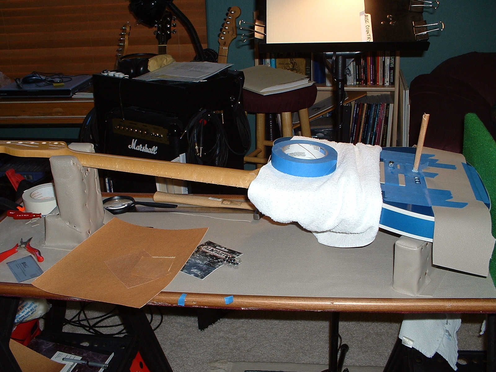 The guitar in the workstation - prepping it to widen the string ferrule holes. Although somewhat time consuming, better to protect the finish then end up with scratches.