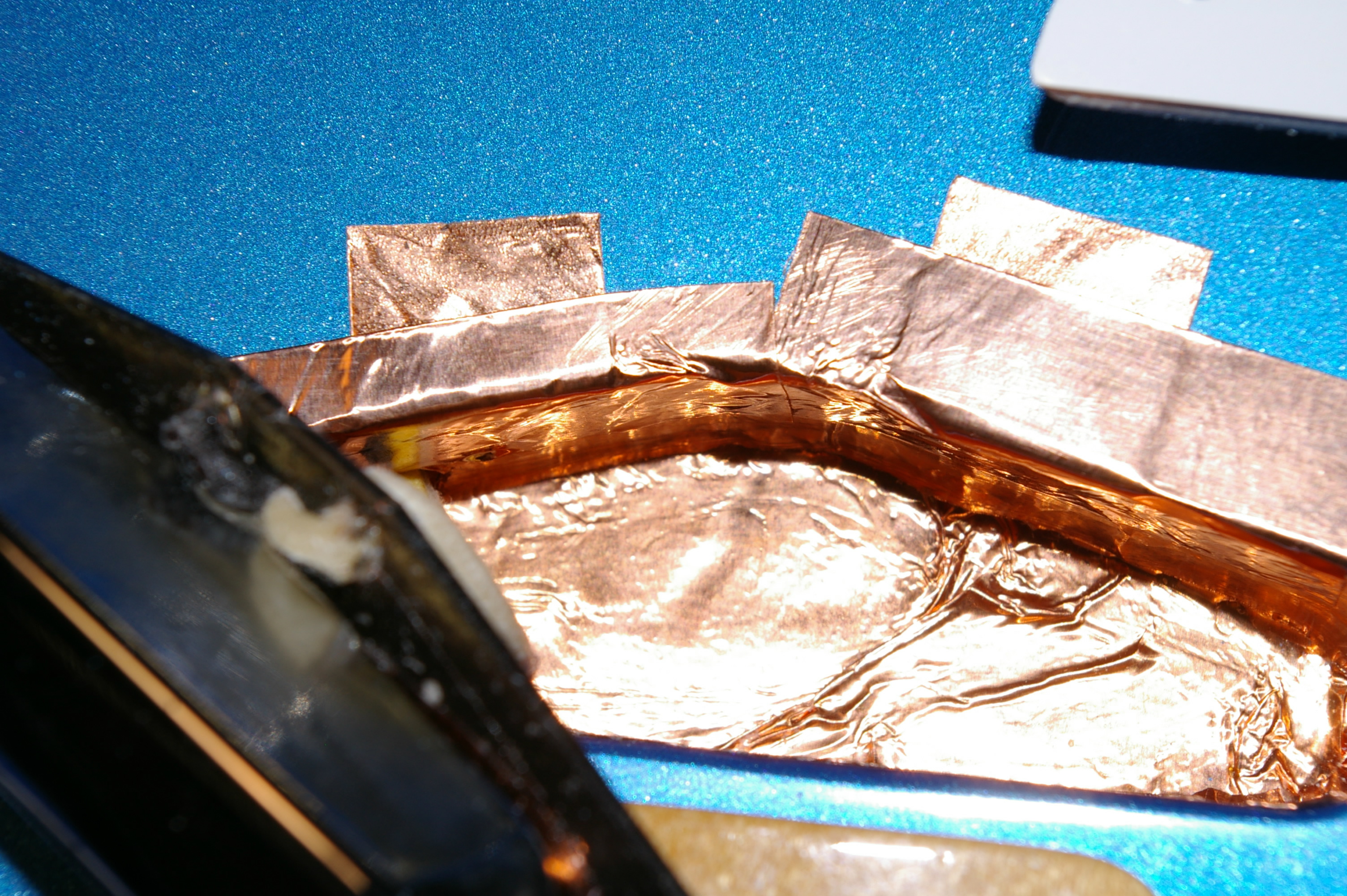 After finishing shielding the cavities I went back and extended the foil on the rhythm cavity so it can contact the foil shielding on the underside of the Pickguard.