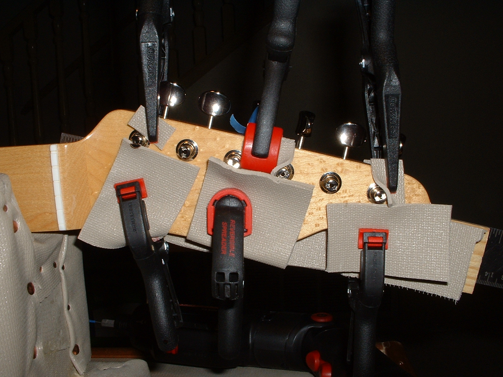Where clamps would touch the neck of body I used scraps or rubber matting that I used to cover the guitar workstation with.