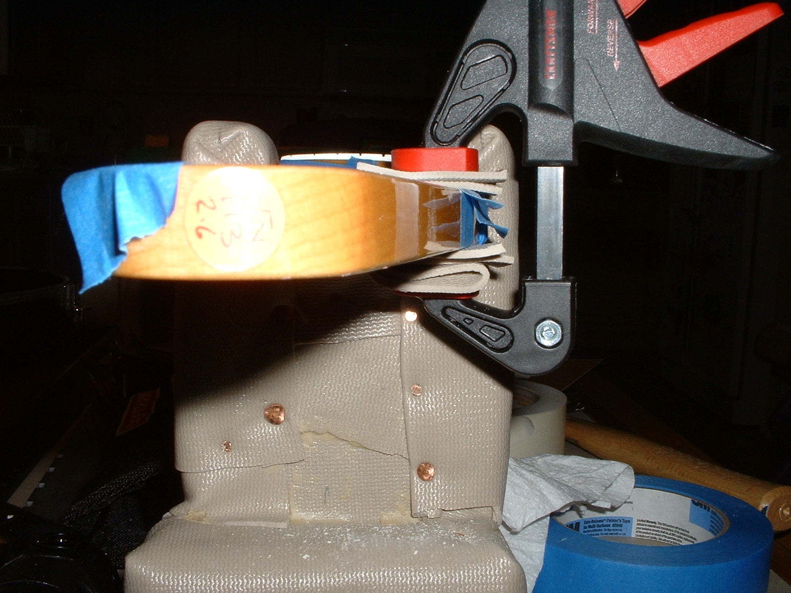 Using a hand clamp and some extra rubber matting pieces I gently "coax" the bushing into place with the clamp. To much force and you could crack the headstock. This is a delicate step to be sure.