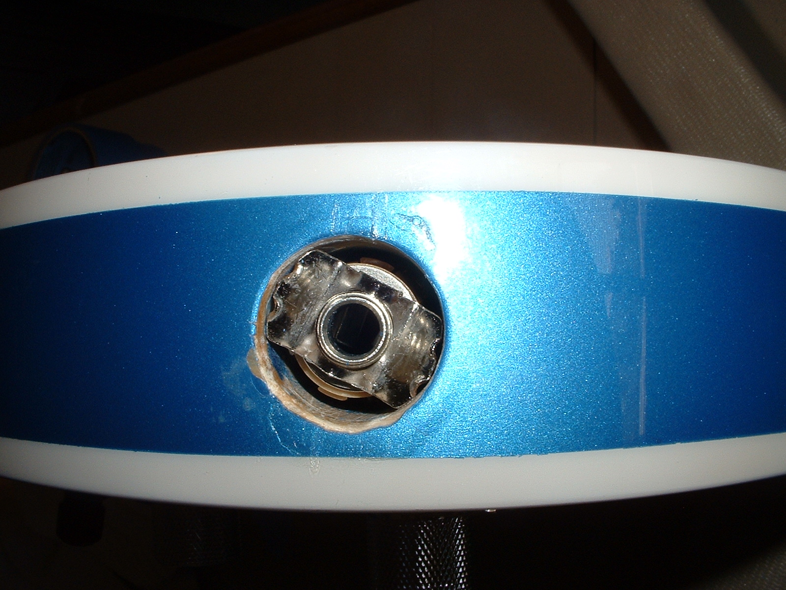 A close-up of the damaged edges around the input jack opening on the body. My repair/glue job was not well executed. Thnakfully the edges of the input jack cover will hide some of this - and not many folks look at the finish around the input jack when they first look at or handle a guitar.