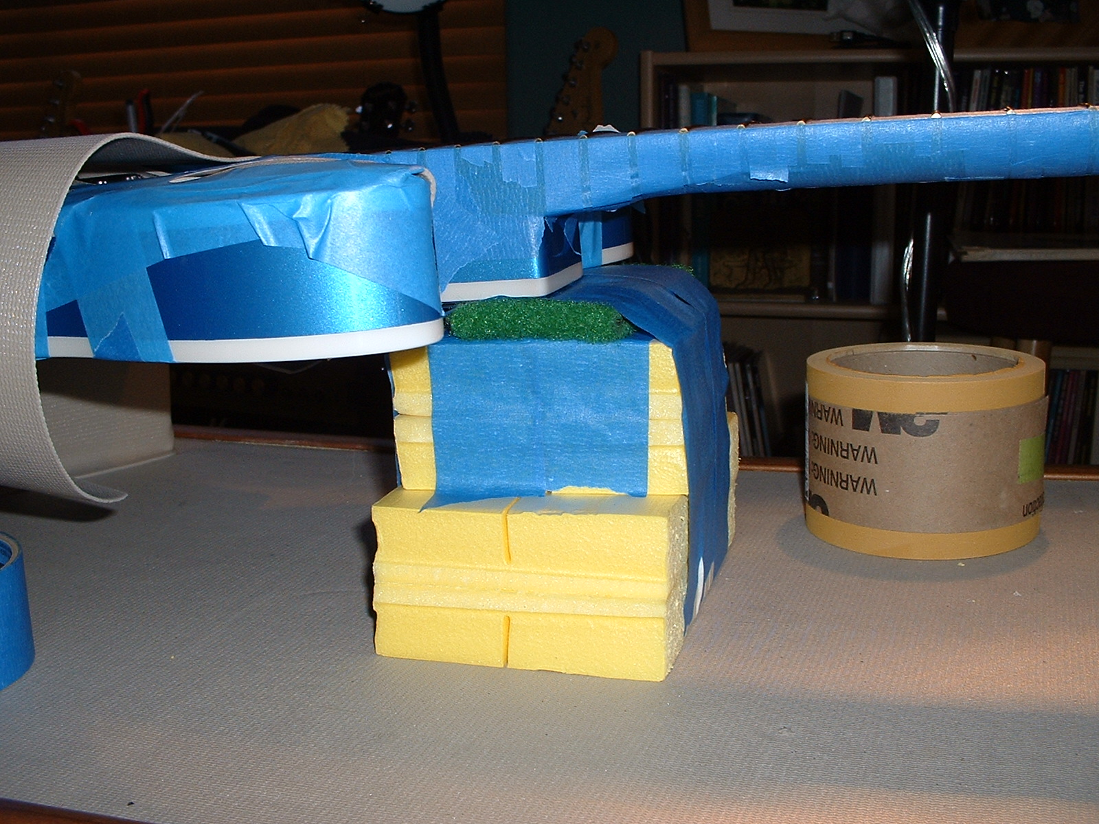 I realized that often I would be exerting some pressure on the neck as I taped. Even though my workstation sufficiently held the guitar I though some extra support right under the neck might be beneficial (who knows…if I slipped while taping and leant on the neck to support me I could have broken the neck - the risk you take when having a beer and working on a guitar...)