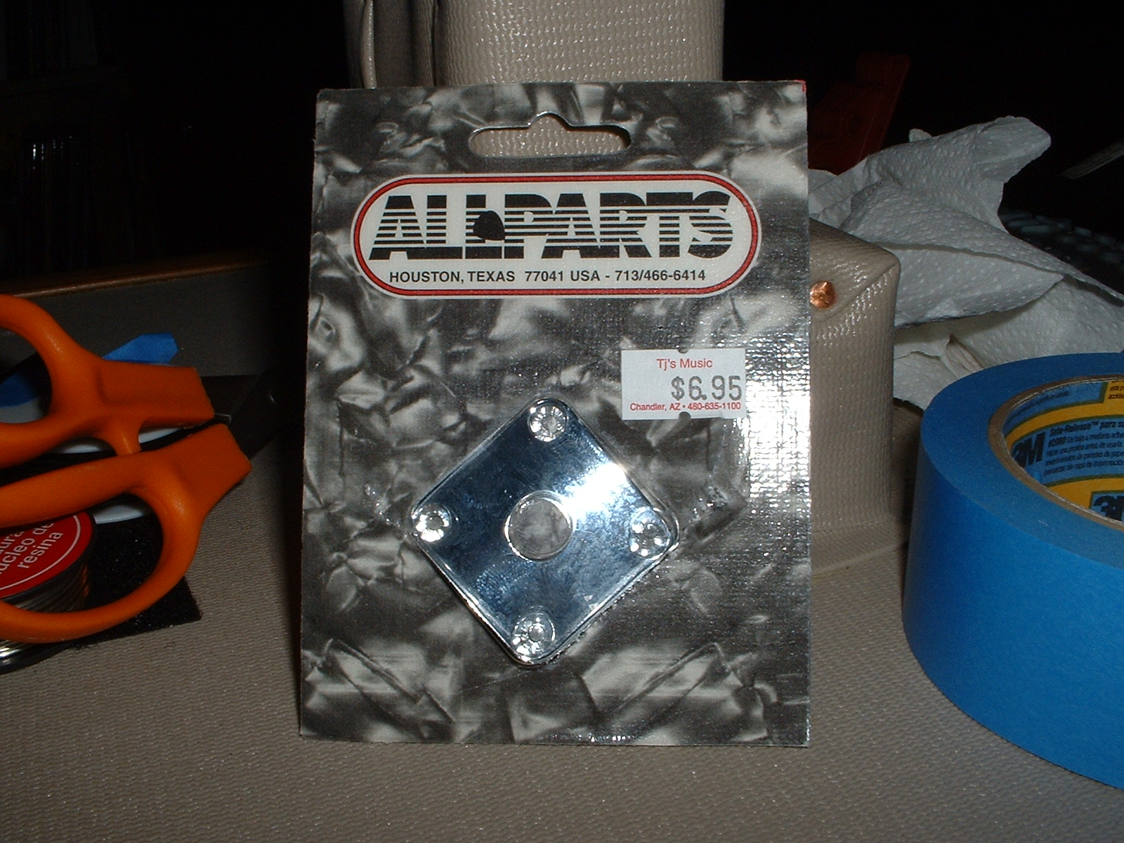 The new input jack cover plate - similar to the Les Paul square cover plate. This will cover the little chip remnants that can be seen with the original recessed "cup style" cover plate. It will also provide a better seat for the input jack. [Added 10/24/06]