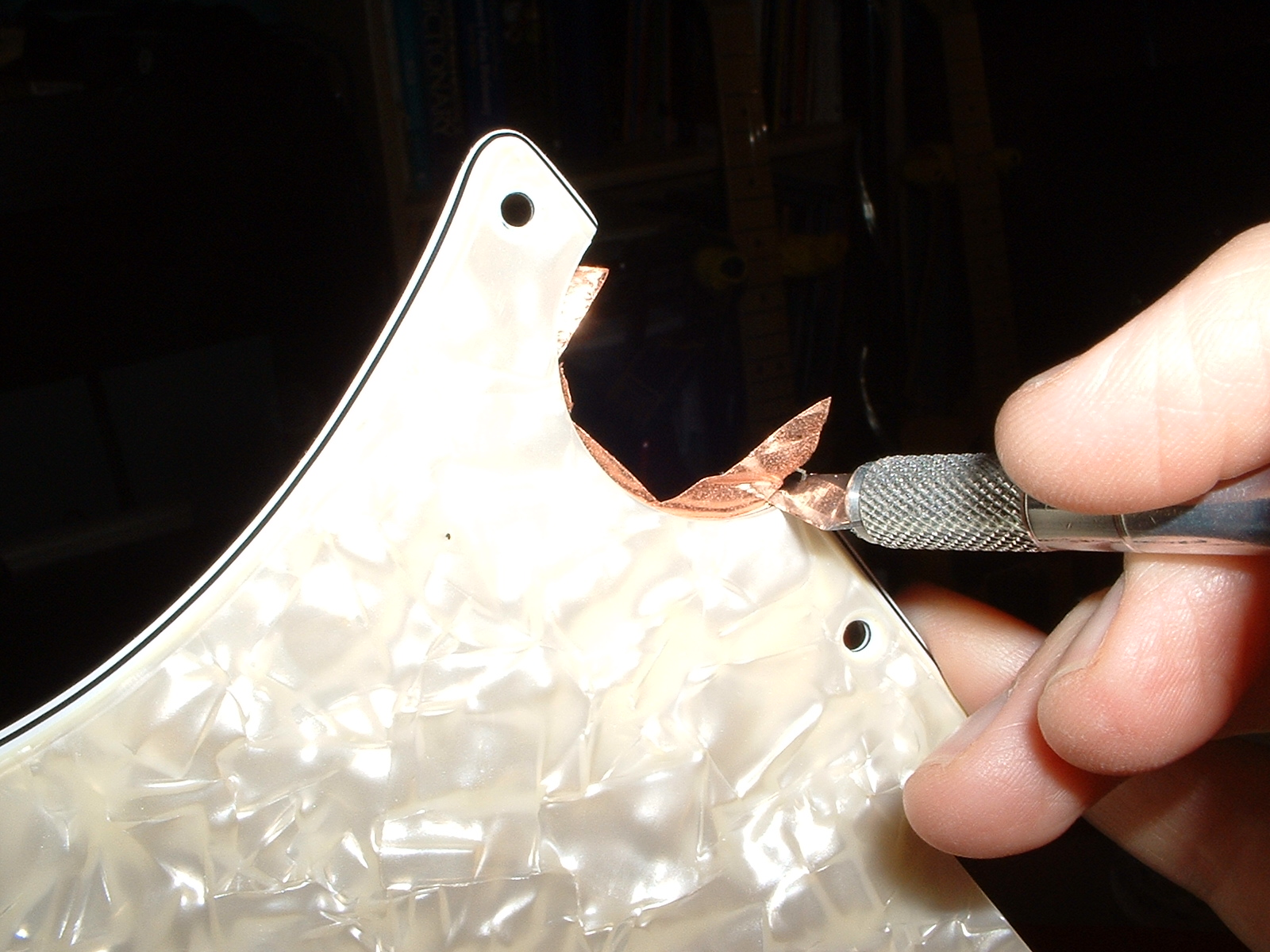 After taping the foil tape down I flipped over the pickguard and using an Xacto knife trimmed away the excess. (I made sure I kept the fingers on my left hand clear of the knife - didn't want a cut on those fretting fingers…) [Added 10/24/06]