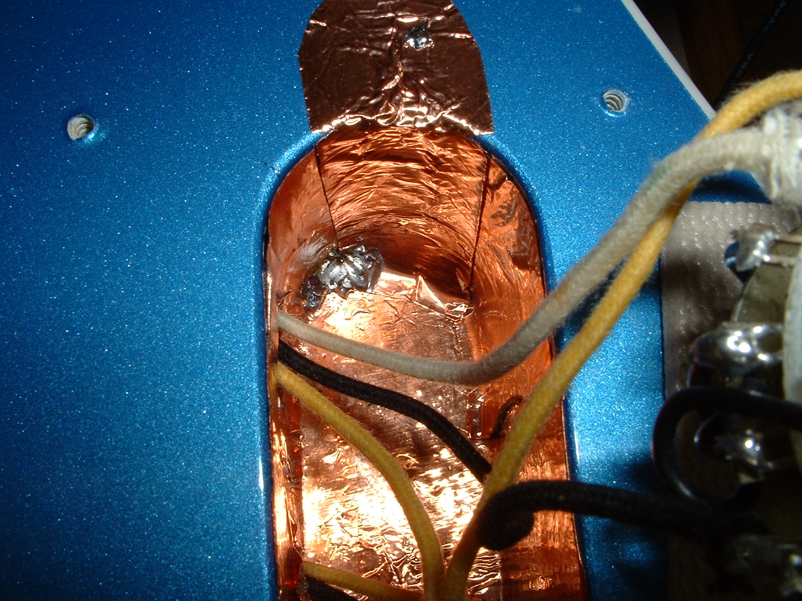 Soldering the connection point for the copper foil on the left side in the control plate cavity. I still need to solder a connection for the tape on the right side. [Added 10/24/06]