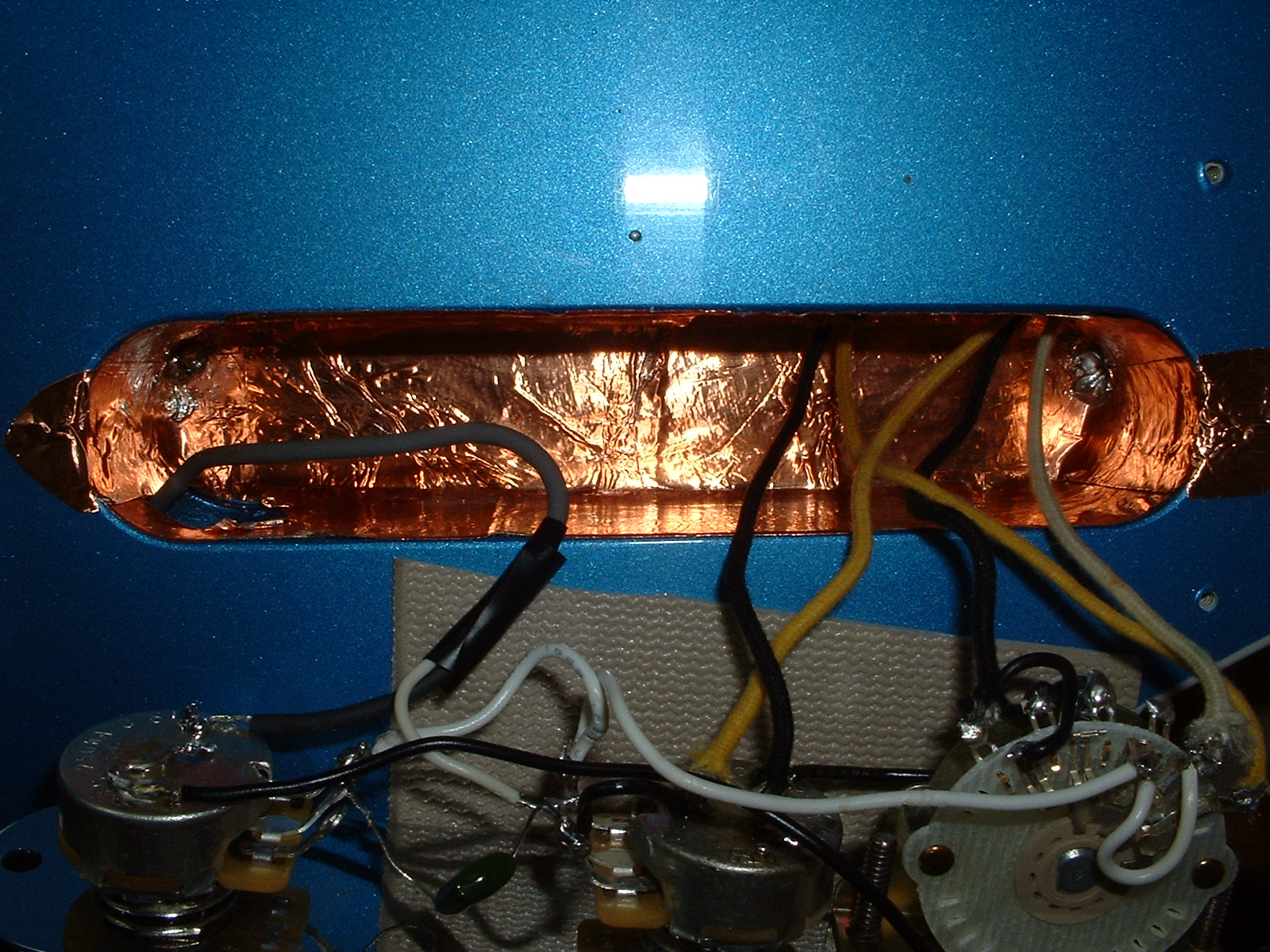 I soldered two connections - to connect each piece of copper foil tape to the tape inside the control cavity. [Added 10/24/06]
