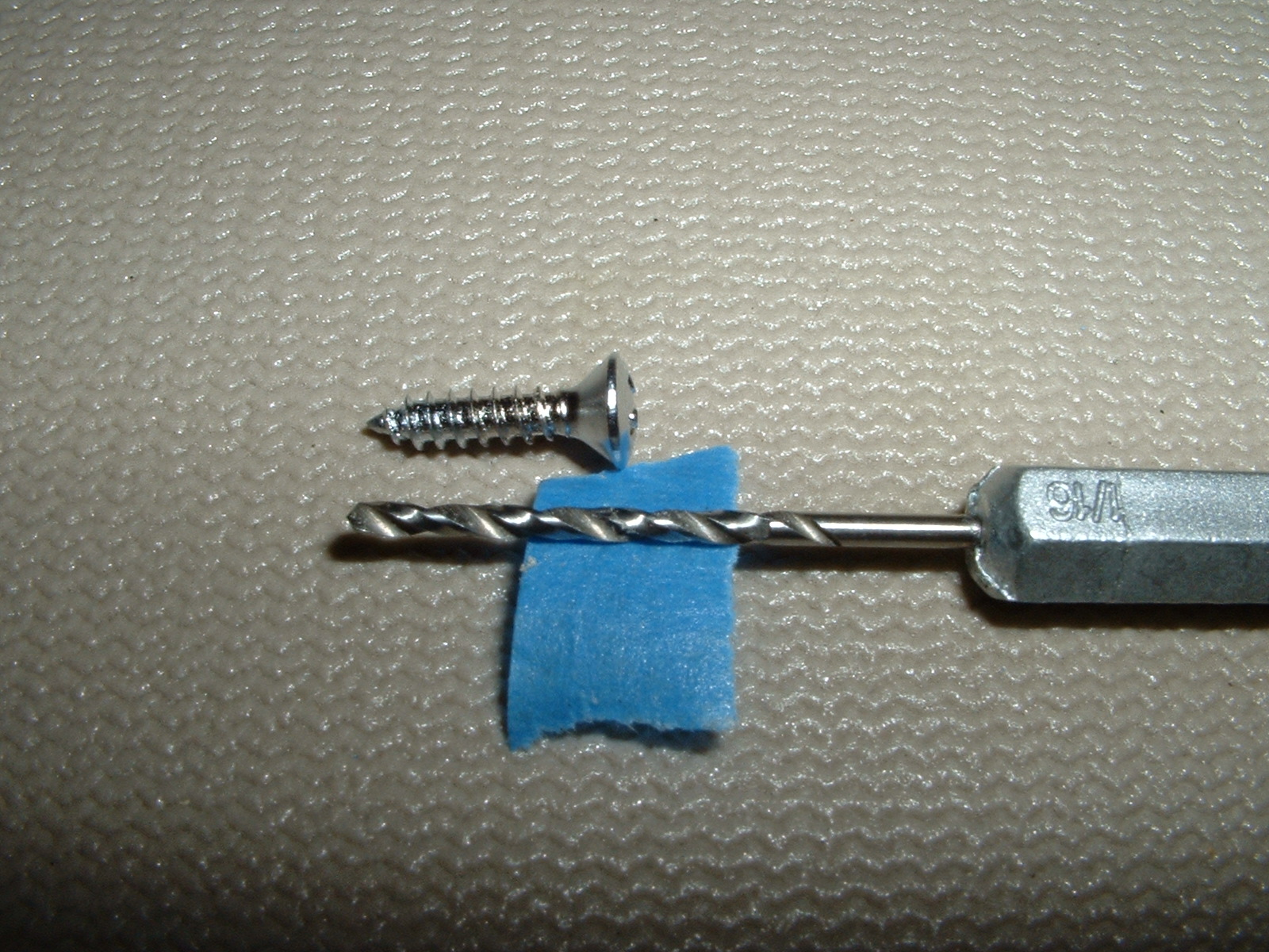 A simple trick. I just "eye balled" the approximate length I wanted to drill - almost the complete length of the screw. A small piece of tape twisted around the bit and I have my depth marker. (Yeah yeah - I know - more tape…) [Added 10/24/06]