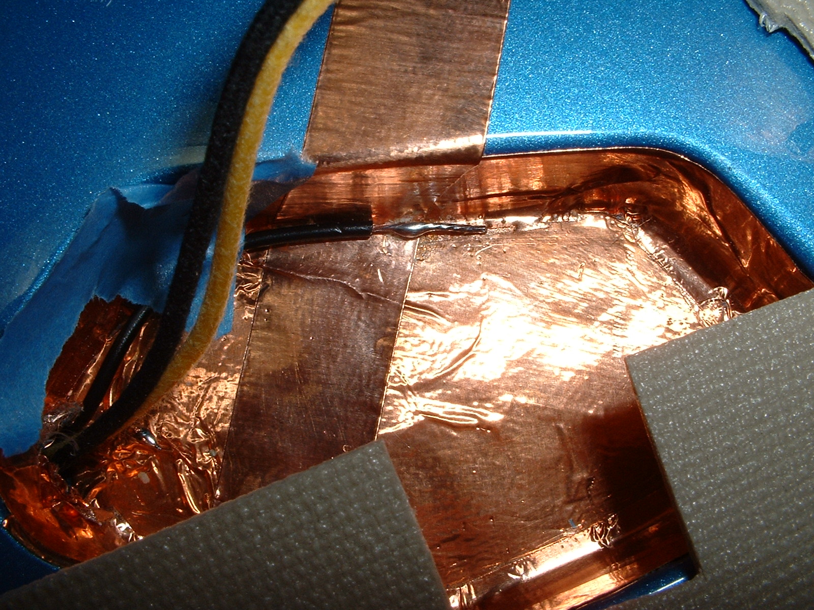 I allowed some extra length of bare wire to facilitate having the solder joint spread across the wire and the two copper foil tape pieces. [Added 10/24/06]